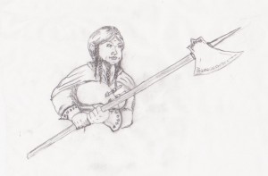 Instead her brain wandered back to her last conversation with Gwenidan. Conversation? Not really she thought, more like a kick in the head. For the hundredth time Hella wondered if Gwenidan had spoken the truth or if she just wanted Hella gone. Why, all of the sudden, did joining the Maidens of the Ax require an initiation? To Hella’s memory no such requirements had ever been spoken of before. Never had anyone heard that in order to join the clan of the female warriors one had to go out into the word of elves and men and what ever else stalked the land and prove one’s self. So why had Gwenidan, as the new head of the clan, required that Hella and the other three new supplicants had to leave the mountains. What could possibly be learned out here?